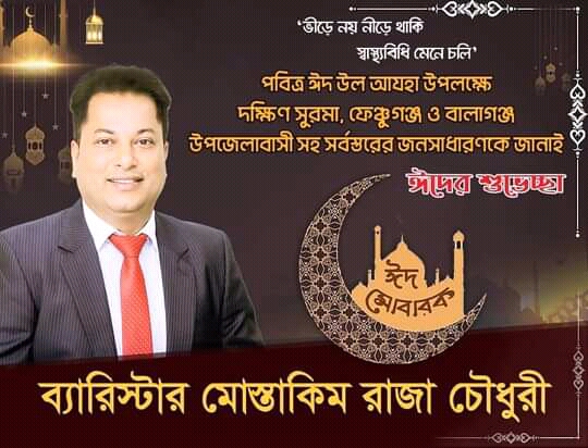 পবিত্র ঈদুল আজহা উপলক্ষে সিলেটবাসী সহ দেশ বিদেশের মুসলিম উম্মাহর প্রতি ঈদের শুভেচ্ছা জানিয়েছেন তরূণ সমাজসেবক ব্যারিস্টার মোস্তাকিম রাজা চৌধুরী।