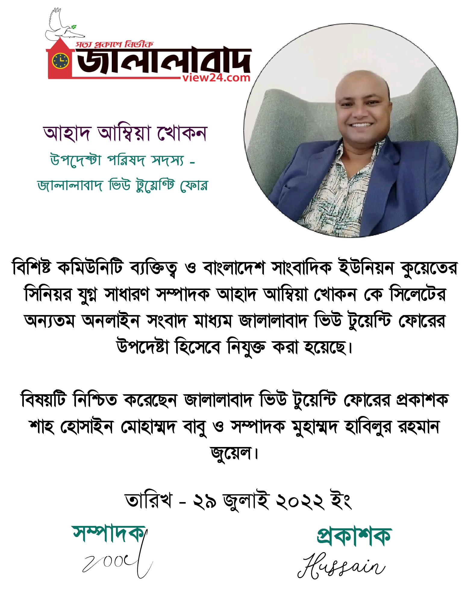 বিশিষ্ট কমিউনিটি ব্যক্তিত্ব ও বাংলাদেশ সাংবাদিক ইউনিয়ন কুয়েতের সিনিয়র যুগ্ন সাধারণ সম্পাদক আহাদ আম্বিয়া খোকন কে সিলেটের অন্যতম অনলাইন সংবাদ মাধ্যম জালালাবাদ ভিউ টুয়েন্টি ফোরের উপদেষ্টা হিসেবে নিযুক্ত করা হয়েছে।