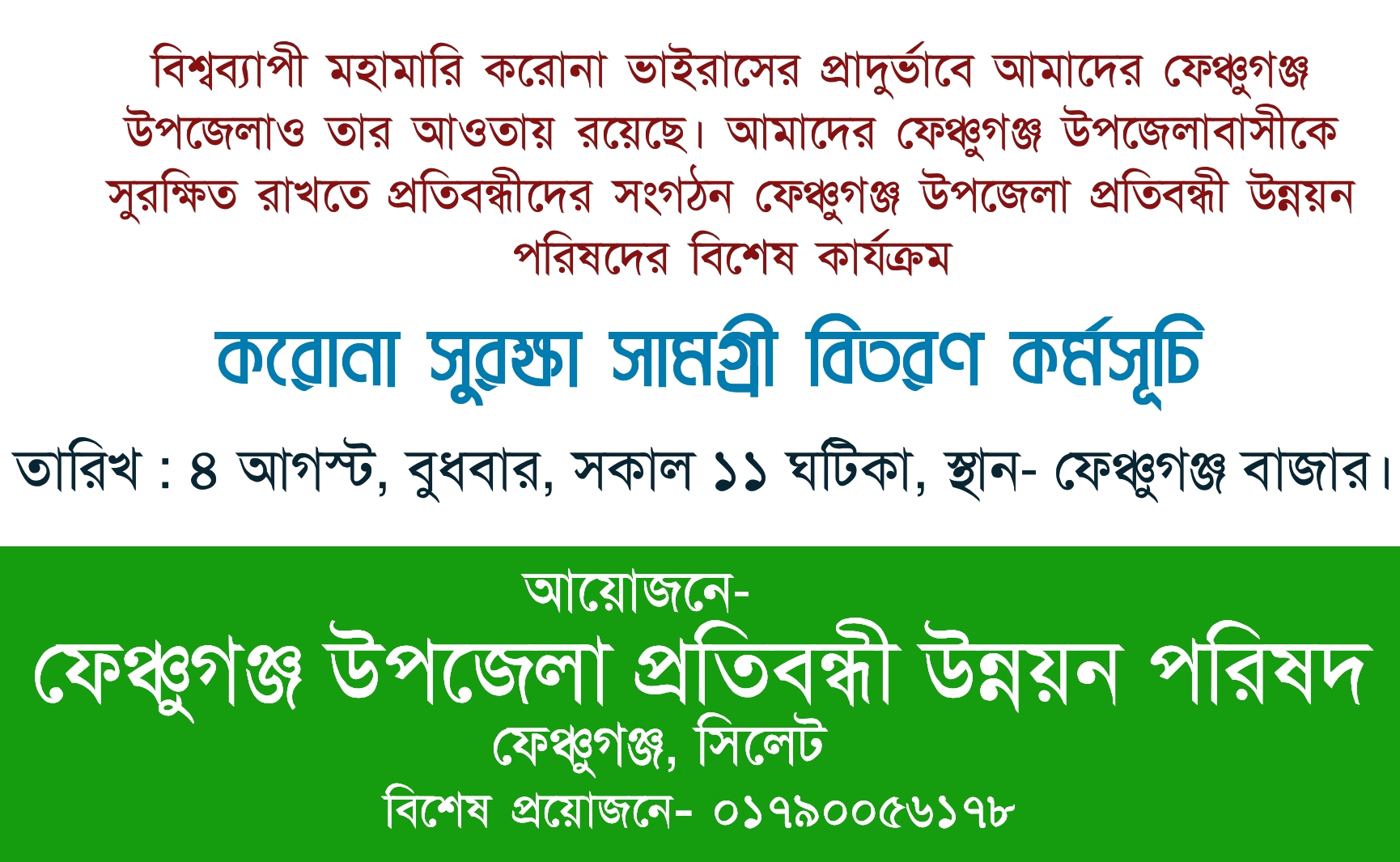 – ফেঞ্চুগঞ্জ উপজেলা হাসপাতালের যেকোন ১টি তলা পুরোটাই করোনা রুগীদের জন্য বরাদ্দ চাই। প্রয়োজনীয় ডাক্তার নার্স অক্সিজেন, ঔষধ সহ।